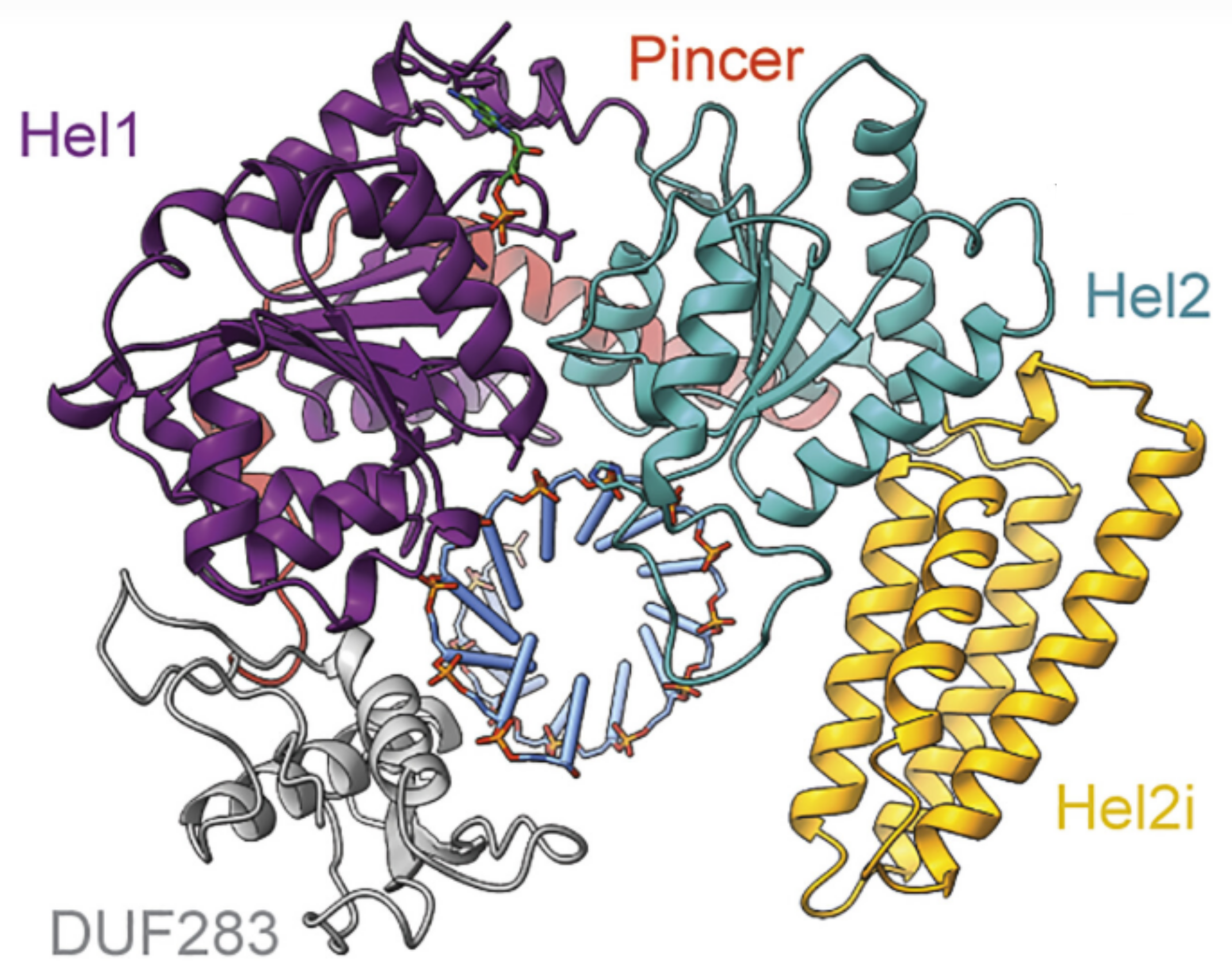 Among animals, the contribution of Dicer’s helicase to recognition and elimination of viral double-stranded RNA (dsRNA) varies from phylum to phylum. Vertebrate Dicers show no helicase activity, while an arthropod ortholog uses helicase translocation to efficiently move dsRNA into Dicer’s cleavage site. The biochemical and structural basis of Dicer’s helicase function, and the evolutionary events that contribute to divergence in function, have remained unknown. This study shows how ancient Dicer helicase tightly binds dsRNA and couples adenosine triphosphate (ATP) hydrolysis to movement along dsRNA. The data reveal how components of this intricate system declined along different clades of animal evolution.