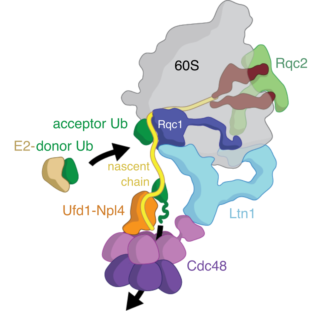 Errors during translation can cause ribosome stalling, leaving incomplete nascent chains attached to large ribosomal subunits. Cells rely on the Ribosome-associated Quality Control (RQC) complex to recognize, process, and remove these aberrant proteins to maintain proteostasis. Despite its importance, the mechanisms by which the RQC orchestrates nascent chain processing and extraction have remained unclear. Here, we present a cryo-EM structure of the RQC complex from budding yeast, revealing how its core components function in nascent chain removal. We show that the Cdc48 ATPase and its Ufd1-Npl4 adaptor are recruited by the Ltn1 E3 ubiquitin ligase to extract ubiquitylated peptides from the 60S ribosome. Additionally, we find that Rqc1 bridges the 60S subunit with ubiquitin and Ltn1, facilitating formation of K48-linked polyubiquitin chains. These findings provide a structural and mechanistic framework for understanding how the RQC complex collaborates to clear stalled translation products, advancing insight into cellular protein quality control.